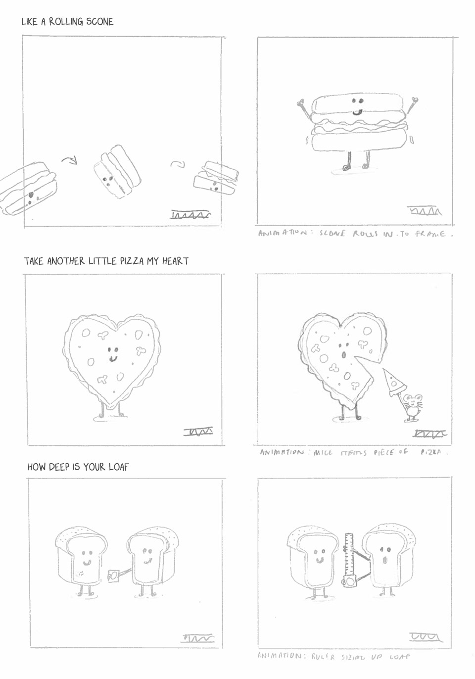I utilised GIF’s instead of still imagery, as this brought to life the playful illustration style in a story telling manner. I developed a range of characters and a consistent colour palette to represent the food puns for each song. Can you guess the 9 songs?