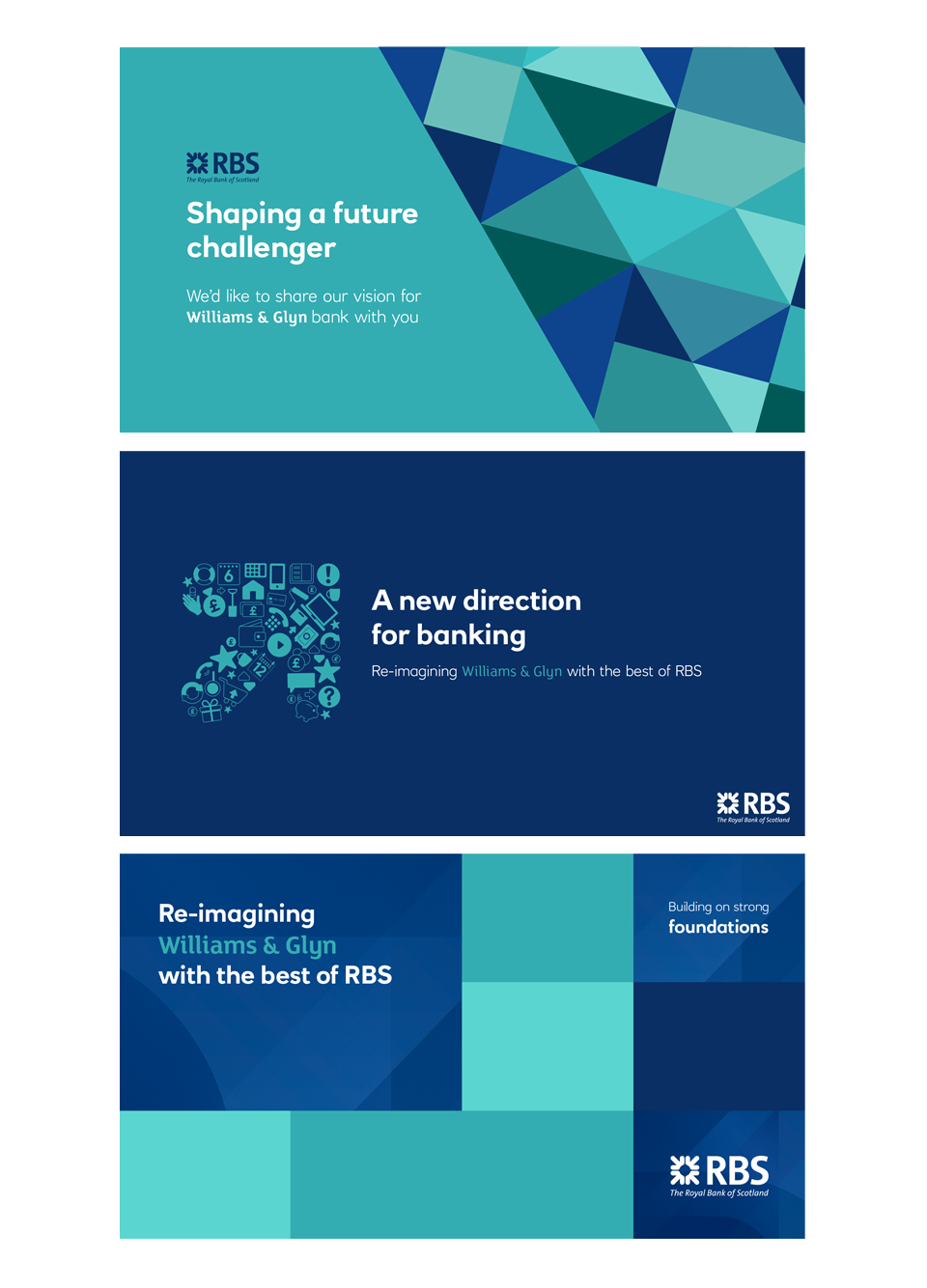 I was challenged to create a visual identity to introduce the RBS transformation at a launch event in the Tower of London. Working closely with a copywriter, I developed four creative routes. These were based upon the RBS brand guidelines in combination with the new Williams & Glyn identity and colours.