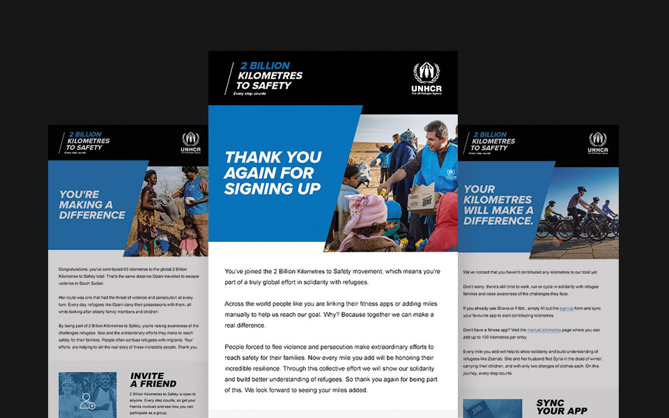 By harnessing the miles covered by fitness app/device users, we are creating a virtual solidarity walk for refugees where people will be asked to contribute to a global target of 1 Billion Miles or 2 billion kilometres. This target represents the cumulative miles walked by refugees globally each year. Users will be asked to sign-up using a form on the website that captures their email and phone number. Alongside this, we will be telling the stories of real refugee journeys and encouraging participants to walk the distances they have covered to reach safety.